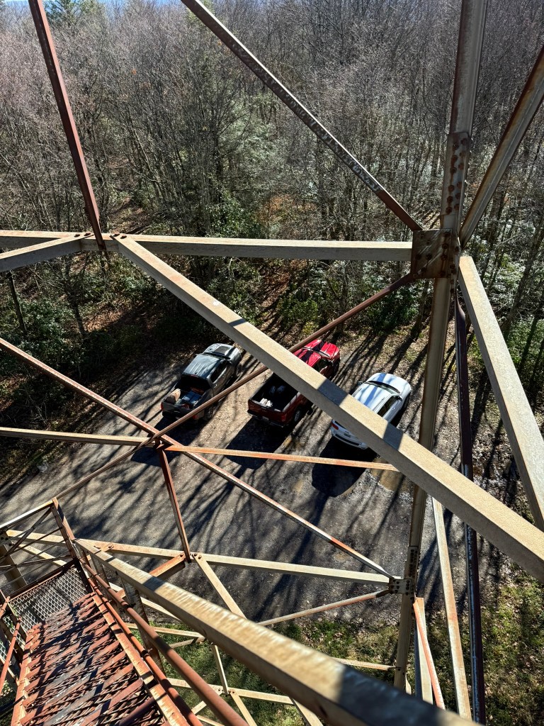 Just off of Forest Road 717, the Olson Observation Tower was the first fire tower in the state of West Virginia, built in 1922. It was later transferred to the Monongahela National Forest and was in active use until 1963, when it was replaced and renamed. To this day it remains open for travelers to visit, and — for those who dare — scale its 133 steps to the cabin top for some incredible photo opportunities. We stopped and began to work off breakfast.