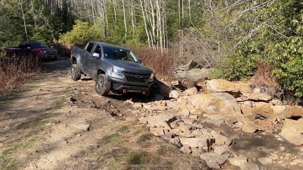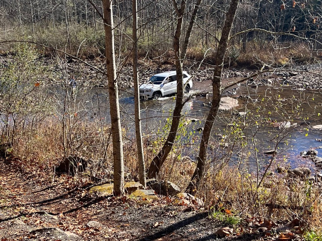 Water crossings, if done improperly, can be dangerous. Aside from the obvious drowning related incidents that can occur when driving a vehicle into rapidly moving water, the more common issues specific to overlanding relate to two failure modes: water ingestion into an engine, and electric failures. To avoid the former, drivers must have a clear understanding of the depth of the water, and the makeup of the ground beneath the water. One must only cross waters that are lower than a vehicle’s fording depth at its deepest point and avoid getting bogged down in mud or damaging their vehicle with large rocks. To avoid electric failures, one must make sure that any and all electric modifications are done properly and sealed against the elements. On forests like Monongahela, rain and seasonal changes can affect a river’s depth dramatically, so much so that Dry Forks can become impassable for a good portion of the year. Today, however, after a thorough investigation of the state of Dry Fork, we assessed that the water level was low enough and safely passable. The riverbed was drivable, with some boulders that could be avoided because they would be visible through the surface of the water. Lobo went first, with only one vehicle crossing the Dry Fork at a time. Should any of the group get stuck, the rest of the group would be equipped for a kinetic recovery. In hindsight, we were likely under-equipped for a water-related failure, but with the condition of the Dry Fork that day, we had determined the risk of such a failure to be low. With the guidance of the rest of the group over radio, Lobo was able to cross with little issue, and no short amount of pucker factor from an inaugural experience of this magnitude. Next was Betty, the lowest-sitting vehicle in the group. Again, with the rest of the group at the ready, Betty crossed with resounding success. Finally, our companion in the F-150 made the crossing, and despite being equipped with low-hanging side steps, had no issues crossing the Dry Fork.