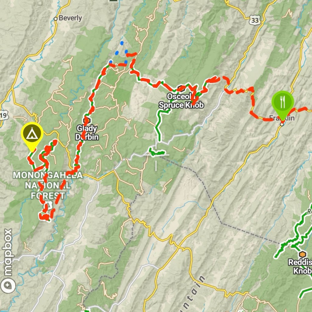 Our intended route for the day would consist of backtracking westward along Fort Seybert Trail back onto the US-33. We would then cross the Allegheny Mountains along the Osceola Spruce Knob Trail, then explore the Monongahela National Forest via Glady Durbin trail and Old Mine Road, ideally finding a campsite along the Cheat Mountain. Following breakfast, we quickly packed up our vehicles and departed for the day.